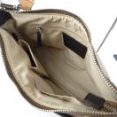 ベージュのキャンバスとレザーのショルダーバッグ、調整可能なストラップ付き。