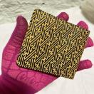 ? レトロな総柄デザイン: キャメル(マスタード系)のベースカラーに、幾何学的なモノグラム柄が映えるクラシックなルックス。