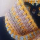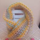 ★モヘア調のカラフルなアクリル毛糸で編んだ、ねじりネックウォーマーです。