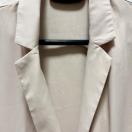 シンプルなベージュのテーラードジャケット、前面にポケットとボタン付き。