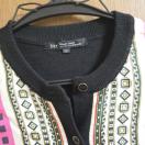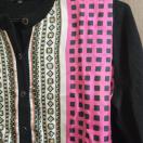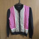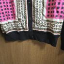 幾何学模様が特徴のピンクと黒のカーディガン。