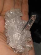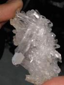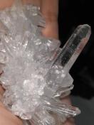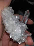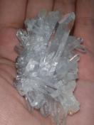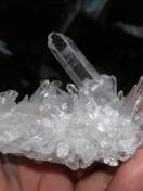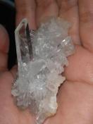 手のひらにすっぽり納まるくらいのミニクラスターです。透明感抜群です。一本すっと伸びたポイントが特徴です。リングかけにしてもよいかも。