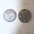 小型50銭銀貨は得年昭和8年 高価格品と旭日龍20銭銀貨 合わせて2個まとめ売り。
