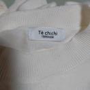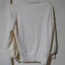 ホワイトのニットセーター、レーススリーブデザインでエレガントな印象。