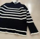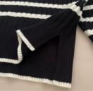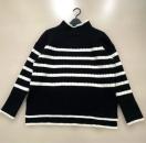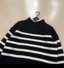 黒と白のストライプが特徴のリブ編みタートルネックセーター。