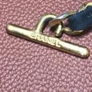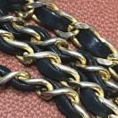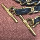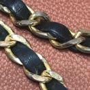 お馴染みのチェーンにレザーが編み込まれ、両端にCHANELロゴのTバーが付いています。