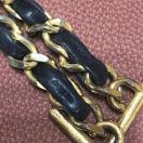 お馴染みのチェーンにレザーが編み込まれ、両端にCHANELロゴのTバーが付いています。