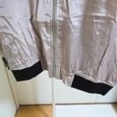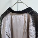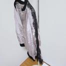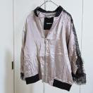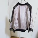 サテン素材のピンク色ジップアップジャケット、レース付きでスタイリッシュ。
