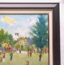 大きな木のある久宝寺緑地公園の初夏の芝広場を描いた作品である。甲子園の10倍の広さと云われているこの公園は大阪の4大緑地の一つで大阪市、東大阪市と八尾市の三市にまたがり、生駒山系の麓、大阪平野の河内地方の一角にある。” 薫風が茶の間に吹き込んで来ると、河内野は初夏を思わせる気候だ・・・” これは今東光の小説”悪名”の書き出しである。季節はまさにそんな時期。初夏の陽光の芝広場を明快に質感のある筆致で描きました。(金山ヒロシ)
