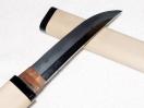 古い脇差しを加工した合法寸法の短刀です。詳しい時代等は分かりませんので画像にて確認お願い致します。刀身は簡易研磨したものですが薄く焼刃が見えます。安全性の為刃は落としてあります。また画像では見えにくい刃こぼれ、傷、錆等があります。ご了承の上ご入札お願い致します。外装は白鞘造で小口部は黒の油性漆塗りです。巾木は銅製です。