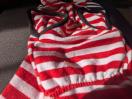 小型犬用の洋服です。カーキ色のスカートが付いています。上は赤と白のボーダーです。