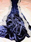 mietteミエットtitivateベロアロングドレスです。深く美しいネイビーの光沢あるベロア素材に、繊細な白いレースがサイドを彩る、大変エレガントな一着です。肌触りの良いストレッチベロア素材は着心地も抜群で、優雅なシルエットが魅力的です。