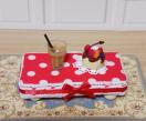 赤と白の水玉模様のミニチュアソファセット、レースとリボン装飾が特徴。