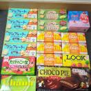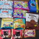 お菓子類、チョコレート菓子、クッキー、ブラウニー、グミ、チョコグミ、あられ、SWISS miss、カップヌードル、くるみっ子詰め合わせ箱などなど91点。