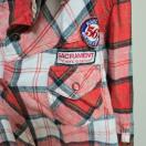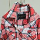 レッドとホワイトのチェック柄、刺繍パッチ付きの長袖シャツ。