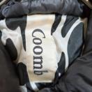 光沢のある黒のダウンジャケット、ボタンとフード付きで、サイドポケットも完備。