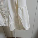 ボタン付きのフリル裾とパフスリーブが特徴のホワイトシャツ。