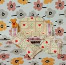 - デザイン: ハート模様のファブリック、ピンクのチェック柄