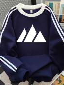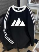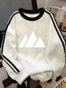 【新作】秋冬コレクションのレディースラウンドネックスウェットシャツ。白地に黒ストライプ、白い三角形の模様が3つ飾られており、普段使いに最適。