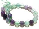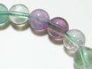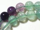 画像は、美しいマルチカラーのフローライト(蛍石)丸玉ビーズ連です。透明感のあるグリーンとパープルのグラデーションが魅力で、光の当たり方によって様々な表情を見せてくれます。
