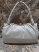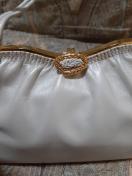 ☆上品な印象のバッグでがま口周りはゴールド金具にブローチの様な飾りになってます。金具根元にブランドマークがデザインされてます。