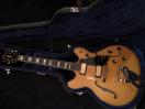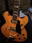 美しいフレイムメイプルのボディに、Bigsbyタイプのトレモロユニット、ゴールドパーツ、そしてブロックインレイが特徴的で高級感があります。 Fホールも目を引きます。