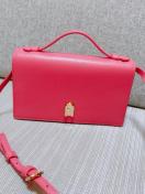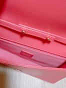 ピンクのレザーショルダーバッグ、ゴールド金具付きでスタイリッシュ。