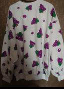 ぶどう柄が全面にプリントされた、ユニークなデザインのスウェットトレーナーです。フロントには「BUDO」の文字が大きくあしらわれています。ゆったりとしたシルエットで、カジュアルな着こなしにぴったりです。
