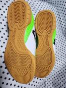 MIZUNO(ミズノ)のフットサルシューズです。白とライムグリーンを基調としたデザインで、ミズノのロゴが特徴的です。ソールの摩耗も少なく、アッパー部分も比較的きれいな状態です。使用頻度は少なかったと推測され、目立った傷や汚れはありません。サイズはタグの記載から23.0cmとなります。
