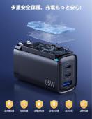 【65W急速充電】:USB PowerDelivery(PD)対応の65W出力を備え、スマートフォンからノートPCまで幅広い機器に急速充電できます。MacBook Air13は約1時間で満充電、従来USB充電器の約7倍のスピード。iPhone15 Plusならわずか30分で50%以上充電可能です。MacBook、ノートPC、タブレット、スマートフォンなど複数のデバイスを同時に充電可能で、複数端末を持つご家庭に最適な65W高速充電器です。