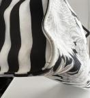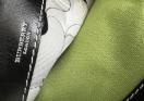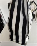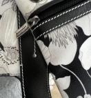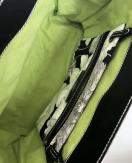 外側は黒と白のシックな花柄で、サイドは黒と白のストライプ柄になっています。内側は鮮やかな緑色で、バッグを開けた際にアクセントになります。