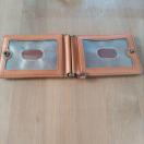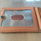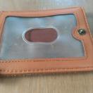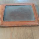 ブラウンレザーの二つ折りパスケース、三つの透明窓付き。