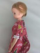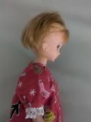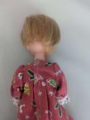 クリスマス柄の可愛らしいワンピースを着用したドールです。金髪のショートヘアで、愛らしい表情が特徴です。目の色は茶色で、全体的に整った顔立ちをしています。