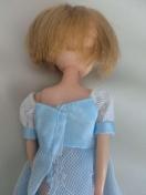 水色の華やかなレースドレスをまとった着せ替え人形です。金髪のショートヘアと愛らしい表情が特徴で、どこか懐かしいレトロな雰囲気が魅力です。コレクションとしても、お子様とのおままごとにもおすすめです。