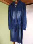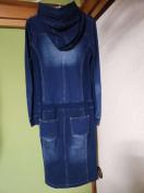 SCOTCLUBのデニム調フード付きロングワンピースです。ストレッチ有デニム地にサイドはリブ編みで、快適な着心地です。カジュアルなスタイルにぴったりで、これからの季節に活躍します。(AI)