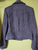 ピーコート風のデザインで、ダブルボタンと両サイドのフラップポケットが特徴です。紺系統の色味で、ツイード調の織り柄が上品さを醸し出しています。