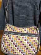 カラフルなブロック柄が特徴的なレスポートサックのショルダーバッグです。軽量でマチもしっかりあり、普段使いに最適なサイズ感です。斜め掛けも可能で、両手が自由に使えるため、お出かけや旅行にも便利です。外側と内側にファスナーポケットがあり、小物の整理もしやすいです。外側は比較的良好な状態ですが、内側の布地には経年による若干の汚れが見られます。