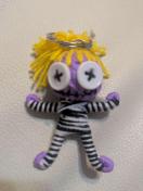 紫色の頭部に黄色のモジャモジャ髪、ボタンの目が特徴的。胴体は黒と白のストライプで、どこかミイラを思わせるユニークな姿をしています。手作りの温かみが感じられる一点もので、カバンや鍵に付けて、毎日の生活にちょっとした遊び心を加えてみてはいかがでしょうか。ポップな色合いと愛らしい表情が、きっと見る人の心を和ませてくれます。軽くて持ち運びにも便利です。あなただけのパートナーとして、ぜひこの機会にご検討ください。締切日時