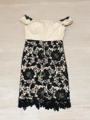 オフショルダーのデザインとレース装飾が特徴のタイトドレス。