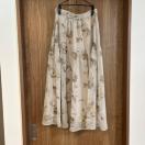 上品なベージュ地に、ブラウンやゴールド系の花柄が美しくプリントされており、歩くたびに揺れるフレアシルエットが女性らしい印象を与えます。