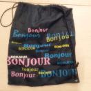カラフルな「Bonjour」デザインのドローストリングバッグ。