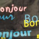 - デザイン: 「Bonjour」の文字がカラフルにプリントされたデザイン