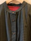 二種のチェック柄の切り替えで、細見せ効果の、バンドカラーシャツワンピースです。