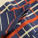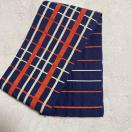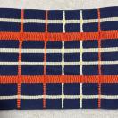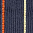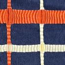 濃紺の地にオレンジと白で格子柄、縞柄の入ったリバーシブルの半幅帯です。