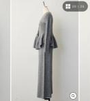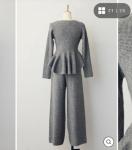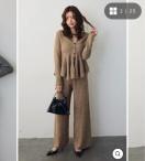 ベージュのニット素材で、ペプラムデザインのセットアップ。