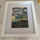 ホワイトの木製フレームにゴッホの星月夜の印刷されたタオルを収めたフォトフレーム。
