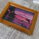 木製のブラウンフレームにイルカと夕日の美しい画像が収められたフォトフレームです。