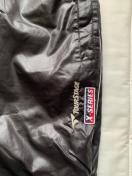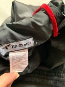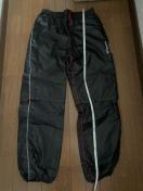 TOURSTAGEのウィンドパンツです。色はブラックで、サイドに白いラインと赤いラインが入っています。ウエストはゴムと紐で調整可能です。スポーツや普段使いに活躍するアイテムです。