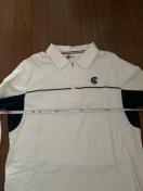 長袖のポロシャツです。ホワイトを基調とし、胸元にCロゴの刺繍、中央に黒いライン、袖部分にネイビーの切り替えデザインが施されています。ゴルフウェアとしても普段使いにも適しています。