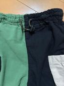BREEZEのキッズ用バイカラーカーゴパンツです。左右で異なるカラーが特徴的で、片方はグリーン、もう片方はブラックのデザインアクセントになっています。両サイドには実用的なカーゴポケットが付いており、小物を入れるのに便利です。ウエストはゴム仕様でドローコードによるサイズ調整も可能。お子様が楽に着用できます。裾もゴムで絞られているため、足元がすっきりとして動きやすいデザインです。